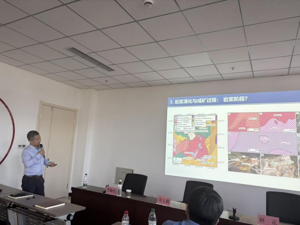 宋玉财研究员以《沉积岩容矿铅锌矿床研究一些进展》为题,系统介绍了密西西比河谷型(MVT)铅锌矿床成矿理论的最新突破,并结合新疆火烧云铅锌矿,详细阐述了沉积岩容矿铅锌矿床的最新成因模式。赵正研究员作了题为《“燕山运动”与关键金属成矿大爆发》的学术报告,围绕钨、锡、钴、镍、铂族等稀有稀贵金属,深入剖析了燕山期构造岩浆活动与关键金属大规模成矿的内在联系,分享了深地探测与矿产勘查领域的最新研究成果。
