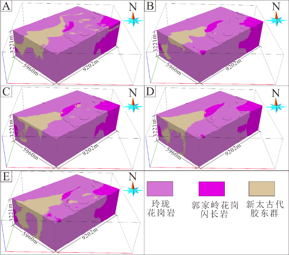 基于(A)RF;(B)3D CNN;(C)3D CNN-CBAM;(D)3D CNN-SAM;(E)本次研究提出方法的三维岩性建模结果