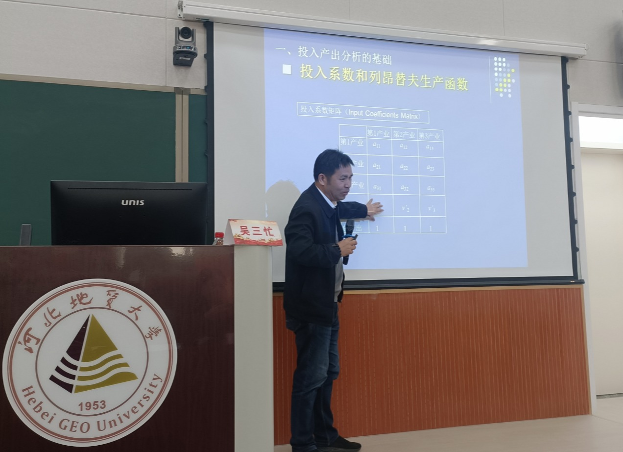 白翠玲对吴三忙教授的到访表示热烈欢迎,并介绍了吴教授的学术成果。报告会上,吴三忙教授简要介绍了中国地质大学(北京)经济管理学院的发展历程、学科特色及办学成果。随后,他围绕“投入产出方法在全球价值链研究中的应用”这一主题,结合自身研究经验,系统分享了投入产出方法在该领域的研究思路与应用价值,为与会教师拓宽了学术视野,提供了有益的方法论启发。与会教师和研究生纷纷表示,吴教授的报告内容丰富、深入浅出,对提升科研能力、拓展研究思路具有积极帮助。